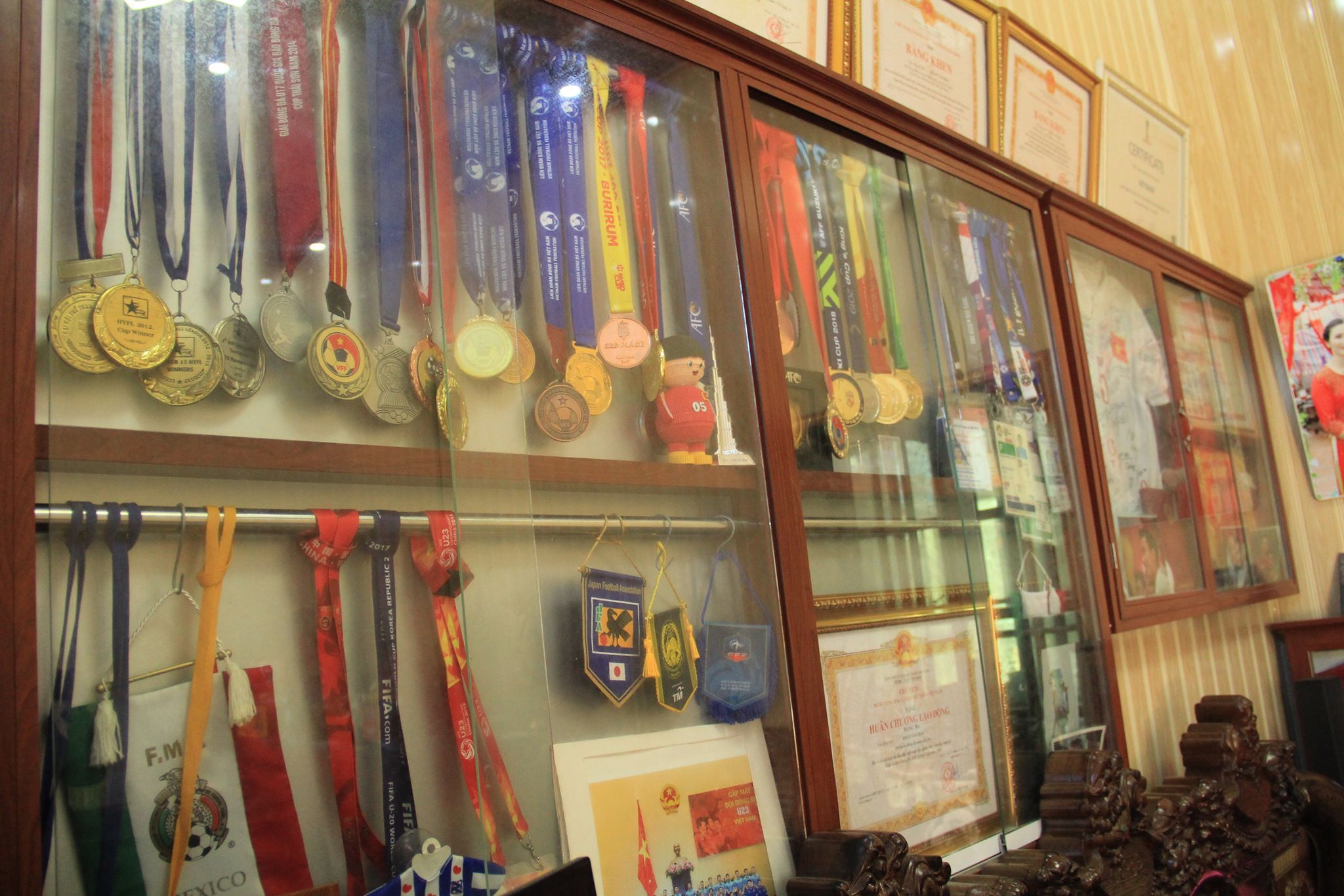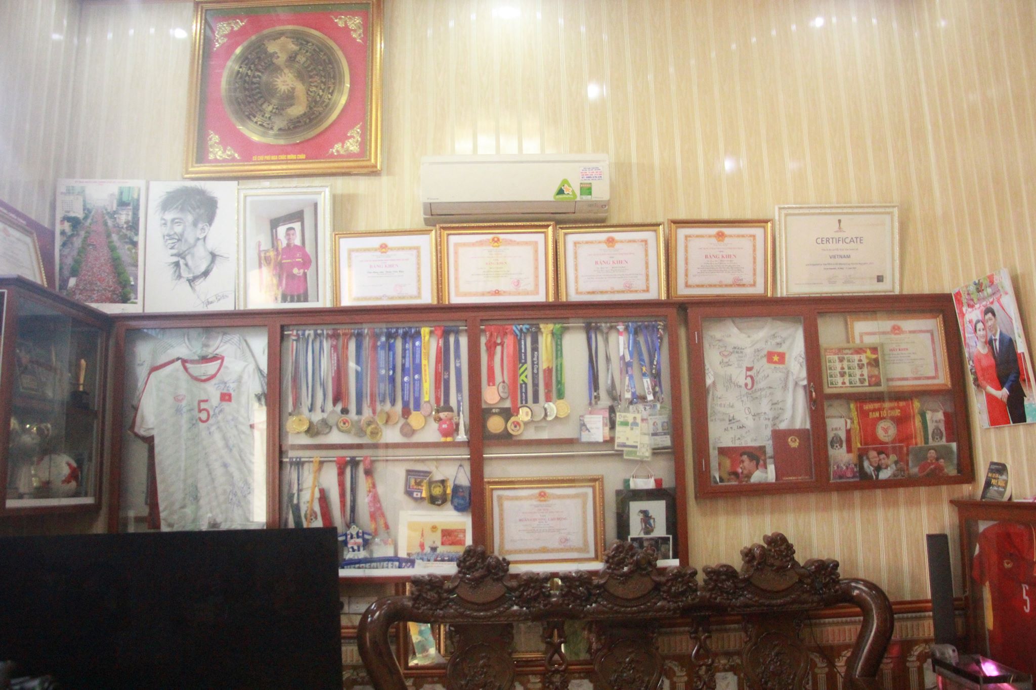 Huy chương treo đầy trên tủ kính ở căn nhà cầu thủ Đoàn Văn Hậu.