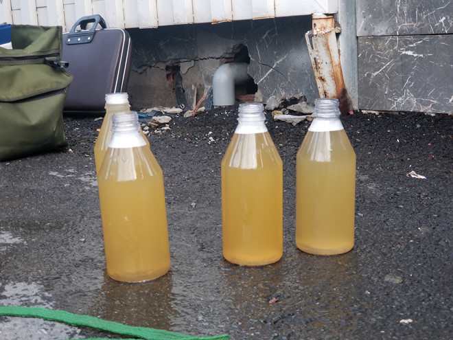 Mẫu nước thải của nhà máy giặt công nghiệp. (Ảnh: Báo Thanh Niên).
