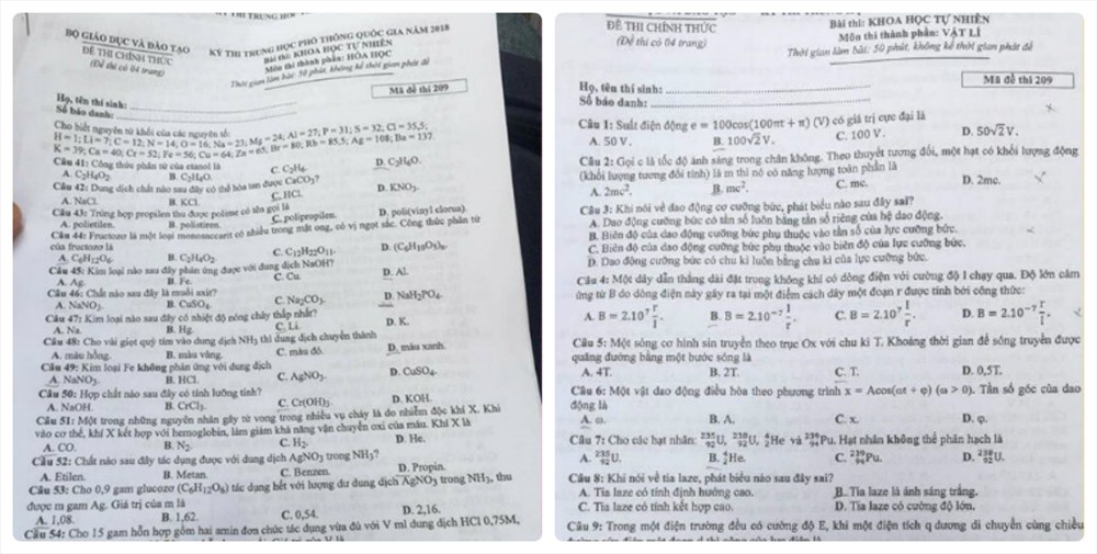 Đề thi Vật lý và Hóa học xuất hiện trên mạng xã hội. Ảnh: Lao Động.