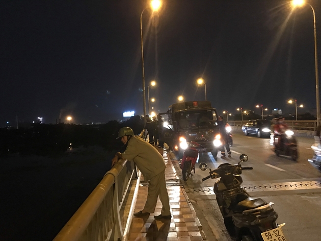 Khi tới giữa cầu, cậu sinh viên để lại ba lô, đôi dép rồi trèo lên lan can nhảy xuống sông Sài Gòn tự tử.