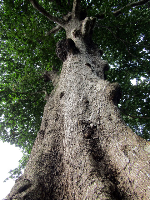 Hàng trăm năm “gội gió” tắm mưa, thân cây mốc thếch, xù xì. Do phần tán lá “mâm xôi con gà” quá nặng, thân cây bị nghiêng, người dân đã dùng luồng làm khung đỡ tán lá cho “kỳ mộc”.