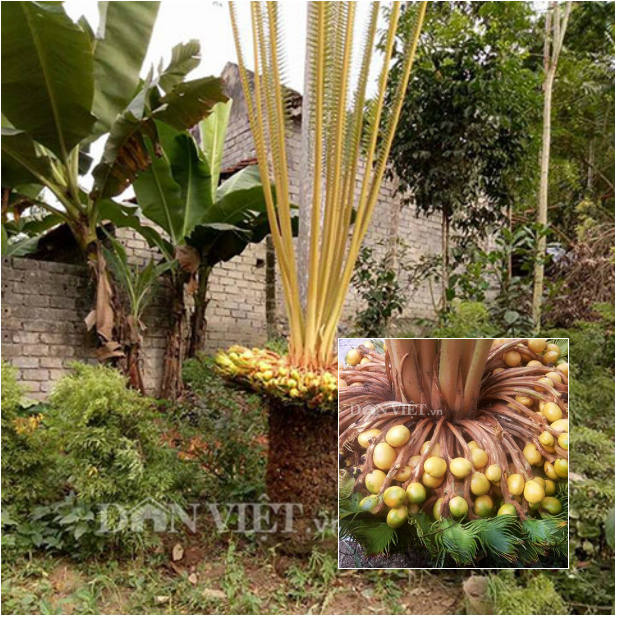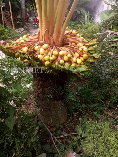 Thân cây vạn tuế cao khoảng 0,8m, đường kính 25cm, trên ngọn cây mọc ra từng chùm quả, ước chừng khoảng 400 quả, nhìn tựu một mâm đầy ắp hoa quả vậy. Và chen vào giữa ngọn cây có 15 tàu lá non đang vươn cao khoảng 2,5m. (Ảnh: Dân Việt)