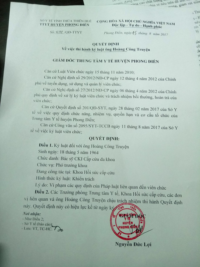 Quyết định xử lý kỷ luật bác sĩ Truyện của Trung tâm Y tế huyện Phong Điền - Ảnh: Đ.THANH