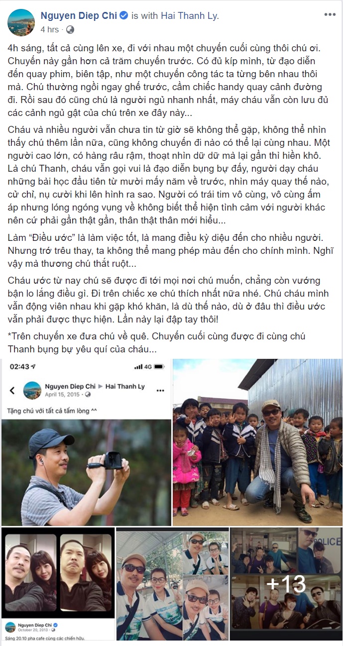 Theo đó, đạo diễn Lý Hải Thanh đã trút hơi thở cuối cùng vào lúc 4h20 ngày 4/11 tại nhà riêng ở Hà Nội, sau thời gian dài chống chọi với căn bệnh ung thư.