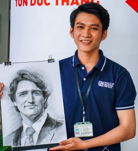 Khi nghe tin thủ tướng Canada sẽ tới Đại học Tôn Đức Thắng để trò chuyện, 9X đã nhanh chóng tìm hình ông Justin Trudeau. Cậu vừa phác họa, vừa vẽ tranh trong vòng 8 tiếng liên tục, với chất liệu là chì và bột than.