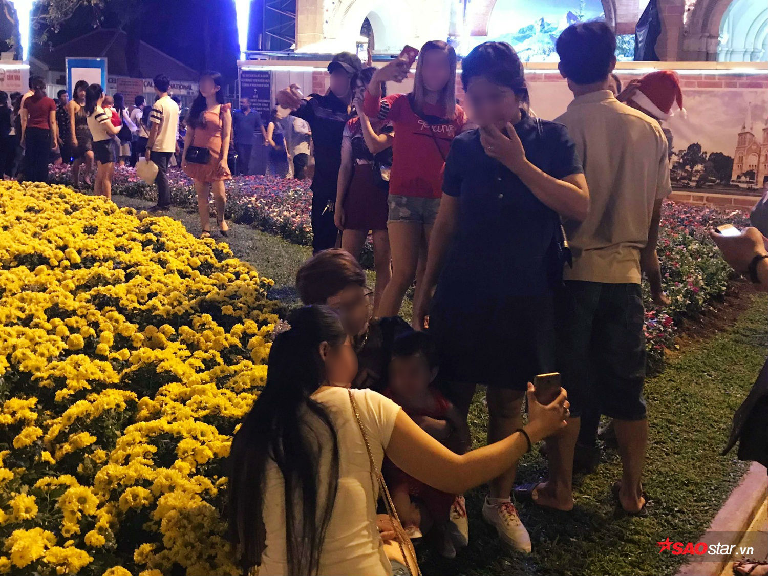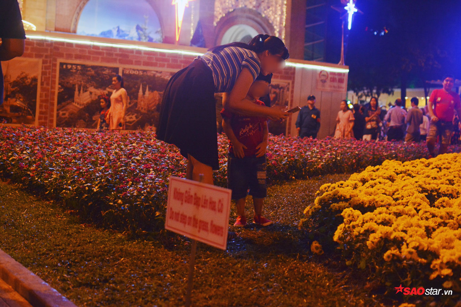 Bên cạnh đó, tại những vườn hoa trước nhà thờ, mặc việc đặt biển báo cấm và sự nhắc nhở của lực lượng bảo vệ, du khách còn vô ý đi vào giữa vườn để chụp hình, check-in. Nhiều luống hoa nhanh chóng bị dập nát vì bị giẫm đạp.