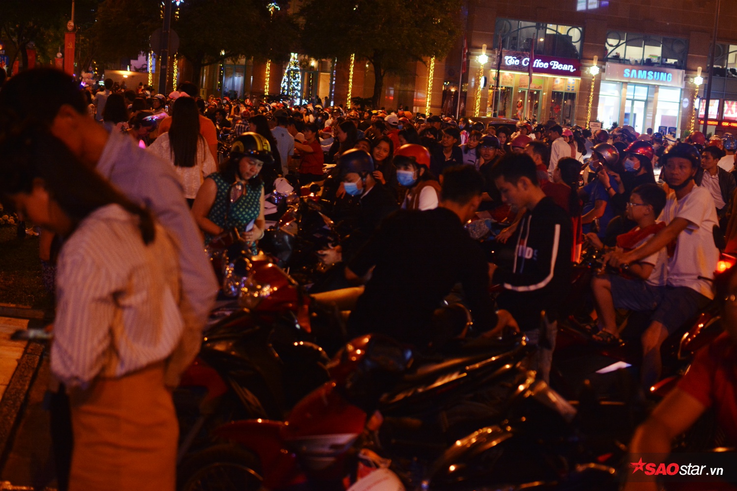 Ngay từ sớm, nhiều du khách đã tập trung trước nhà thờ Đức Bà để chụp hình lưu niệm. Lượng xe tràn ra đường gây ùn tắc lớn quanh con đường Lê Duẩn (Q.1, TP.HCM). Lực lượng chức năng phải liên tục túc trực để giữ trật tự.