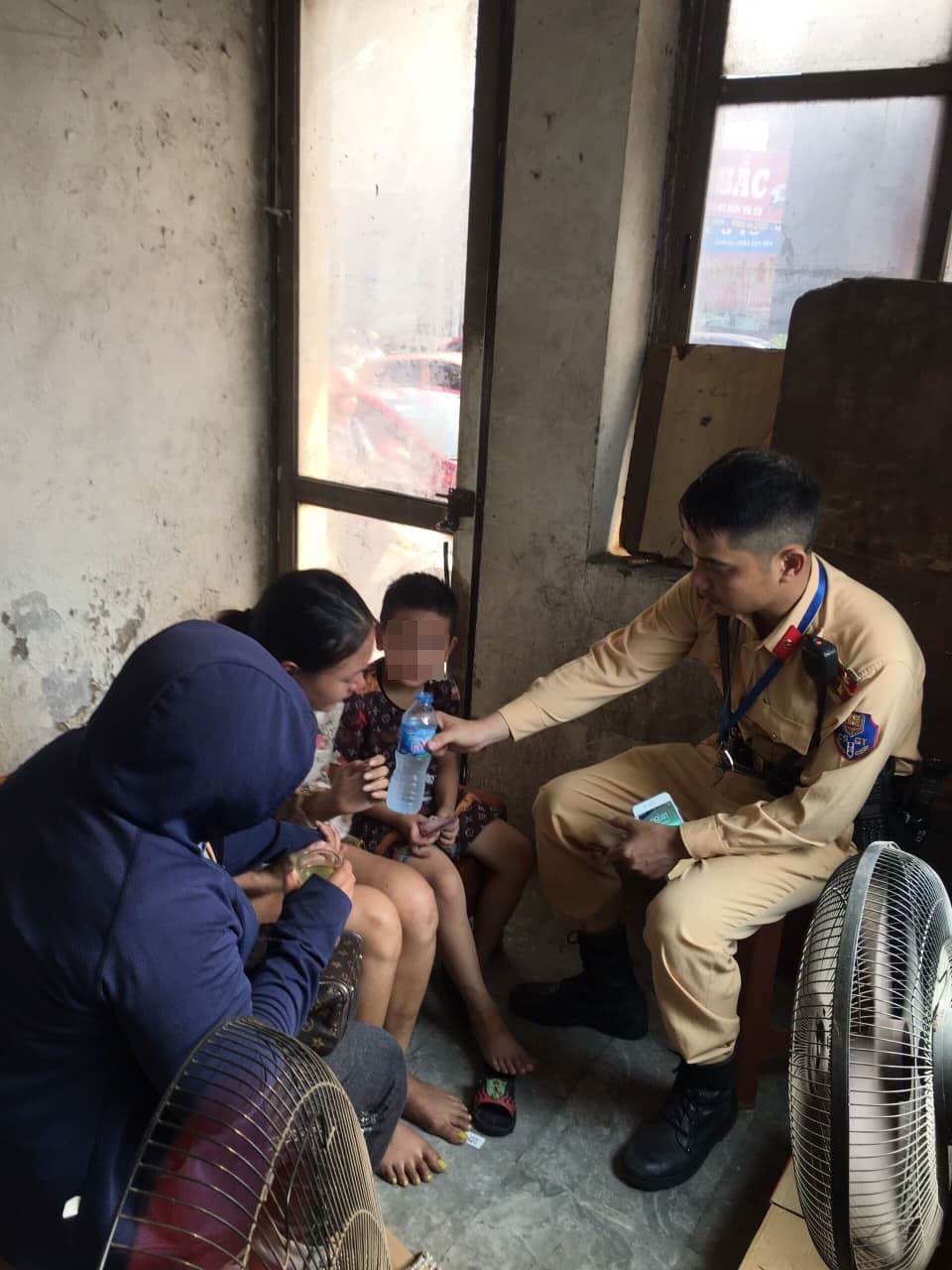 Người phụ nữ cùng con trai tại chốt giao thông