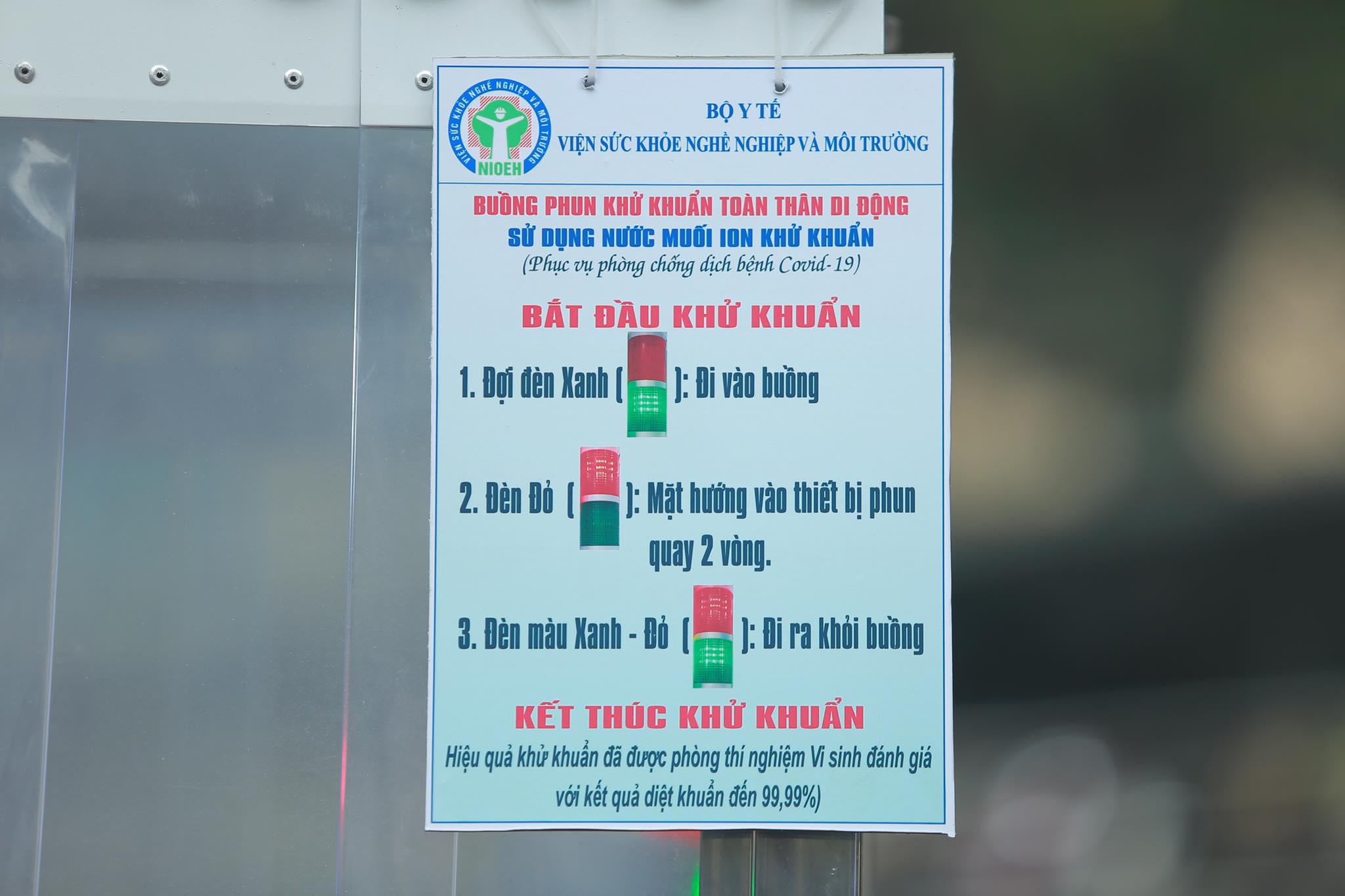 Đầu tiên, người sử dụng được tiếp cận với các hướng dẫn sử dụng phía ngoài buồng khử khẩn qua tấm biển thông tin. Bên trong, hệ thống khử khuẩn dựa trên nguyên tắc sử dụng dung dịch nước muối ion hóa (Anolyte) dạng sương sẽ tự động phun toàn thân nhằm sát khuẩn nhanh bề mặt cơ thể.