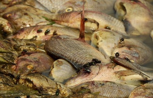 Ruồi nhặng bâu kín số cá chết trong hồ. Ảnh: Minh Cương
