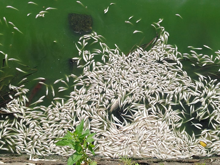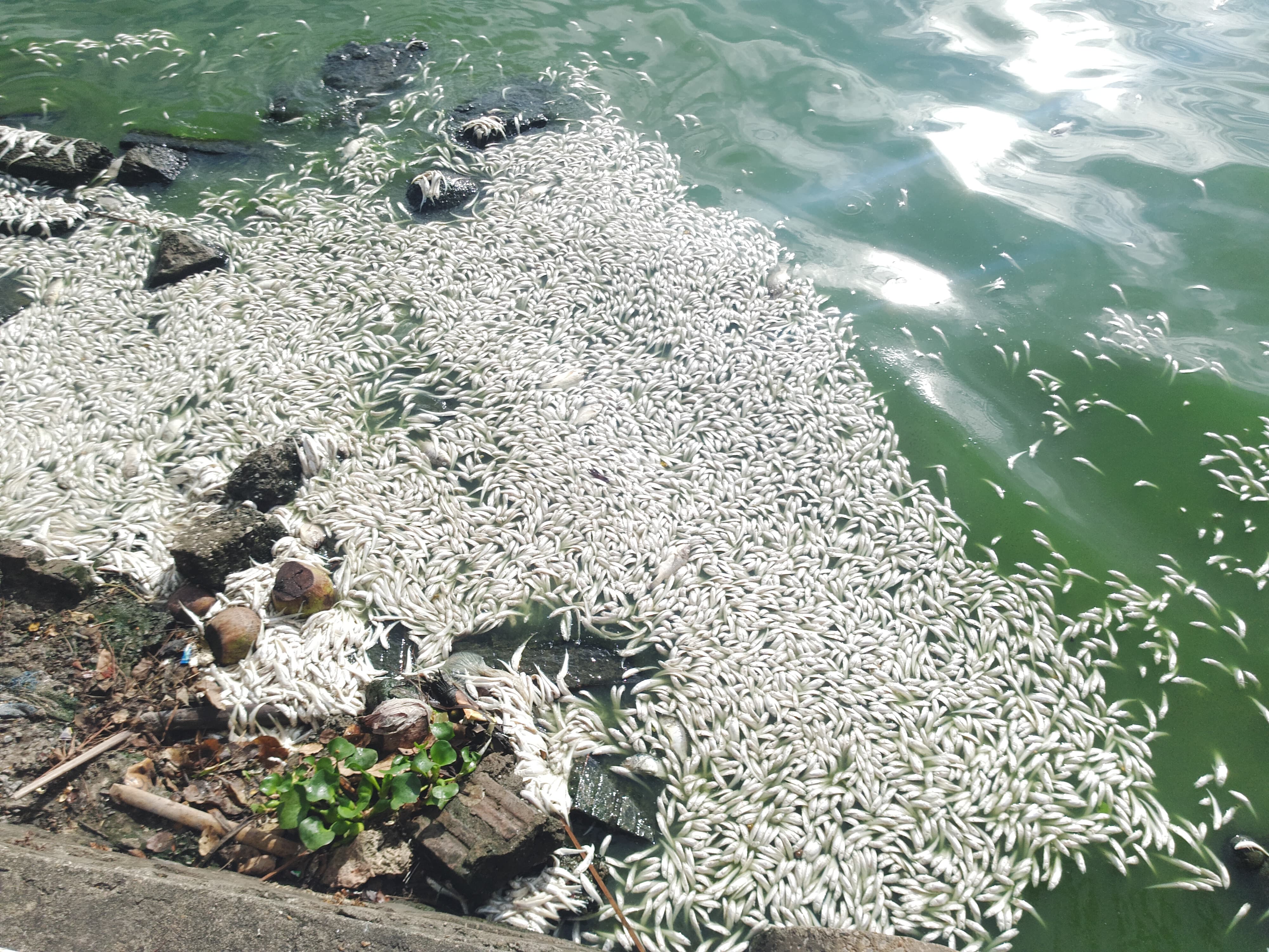 Cá chết hàng loạt, nổi trắng phủ kín mặt nước ven hồ.