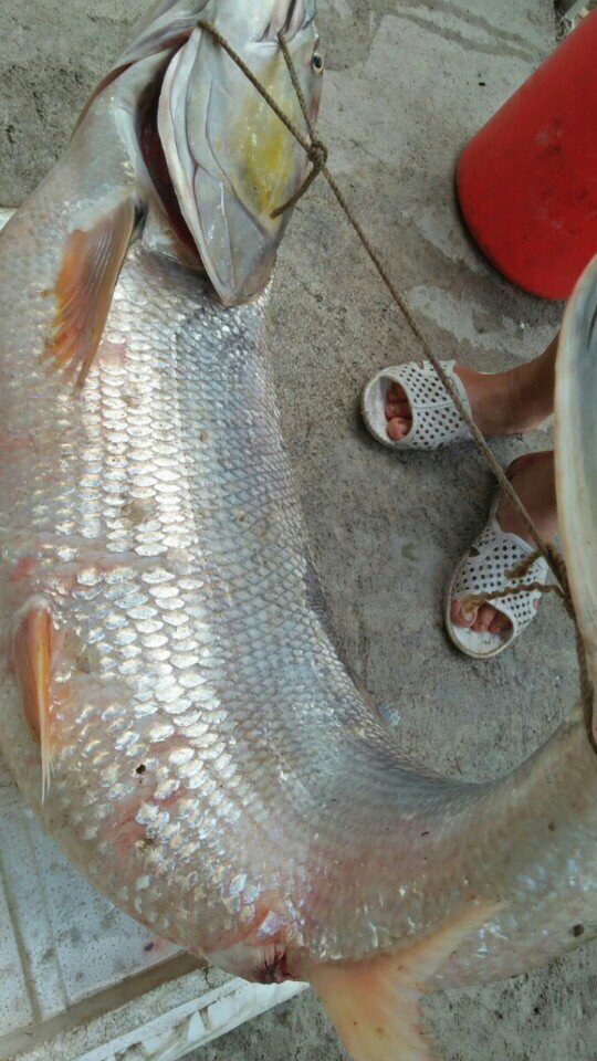 Khi cân lên, không ngoài dự đoán của chồng chị Ngân, con cá nặng khoảng 35 kg. Với hình dáng miệng thì đây là cá măng, chứ không phải cá mè vẫn thường đánh bắt được.