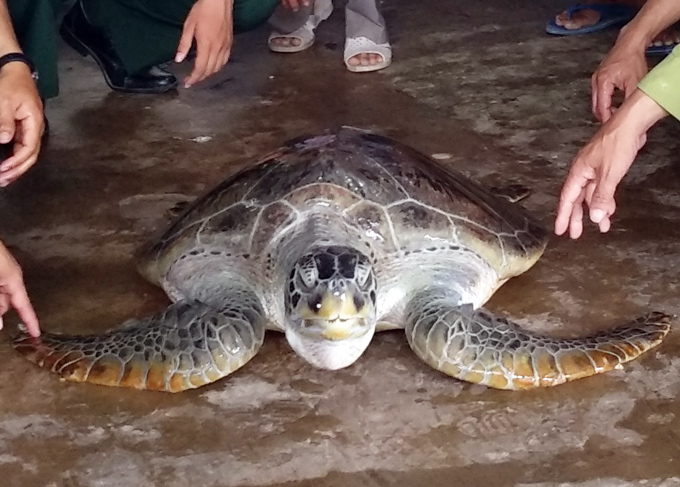 Theo anh Nguyễn Văn Non, ngụ ấp Mũi, xã Đất Mũi, vào khoảng 23h ngày 10.4, trong lúc đánh lưới cá anh phát hiện một cá thể rùa khá lớn bị mắc lưới. Biết là loài rùa biển quý hiếm nên anh Non đã đem cá thể rùa vào vào bờ trình báo với Vườn quốc gia Mũi Cà Mau.
