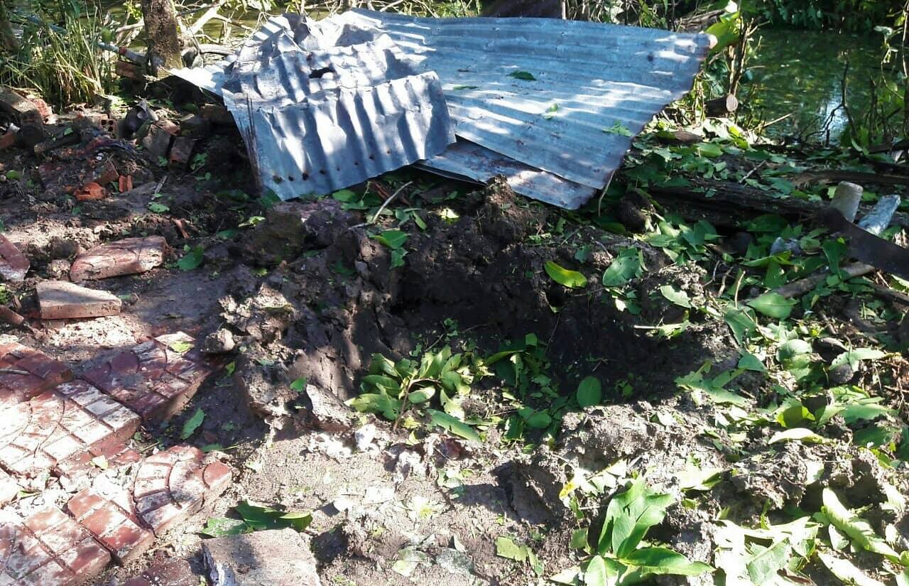 Tại hiện trường, vụ nổ làm mặt đất biến dạng tạo thành hố có đường kính rộng hơn 1m, sâu khoảng 50cm, nhiều cây cối xung quanh bị đổ ngã. Căn nhà cạnh bên vụ nổ cũng bị hư hỏng nhiều vật dụng.