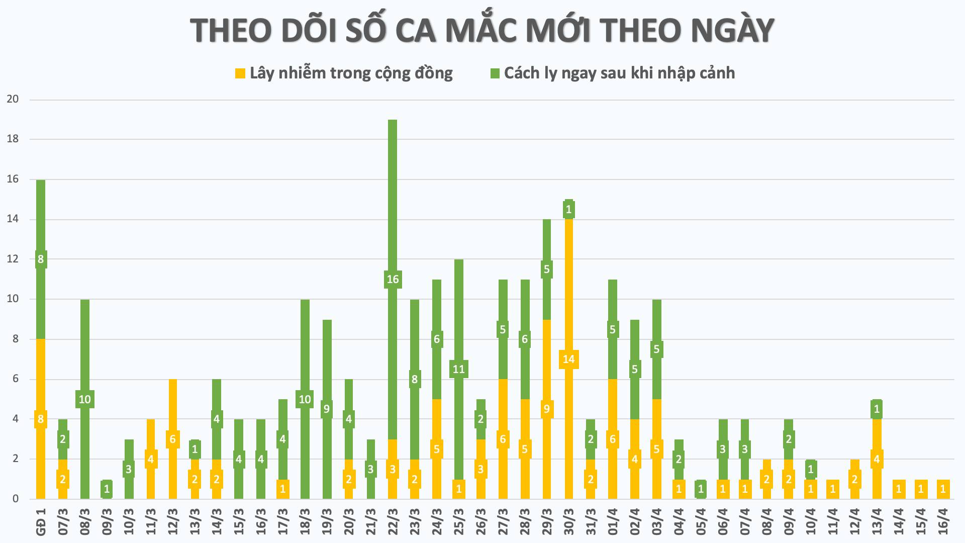 Sáng ngày 16/4, Ban chỉ đạo quốc gia phòng, chống dịch COVID-19 thông tin, đến 6h cùng ngày Việt Nam ghi nhận thêm 1 ca nhiễm, nâng số người mắc lên 268. Tỏng số này có 160 người từ nước ngoài chiếm 59,7%; 108 người lây nhiễm trong cộng đồng chiếm 40,3%.