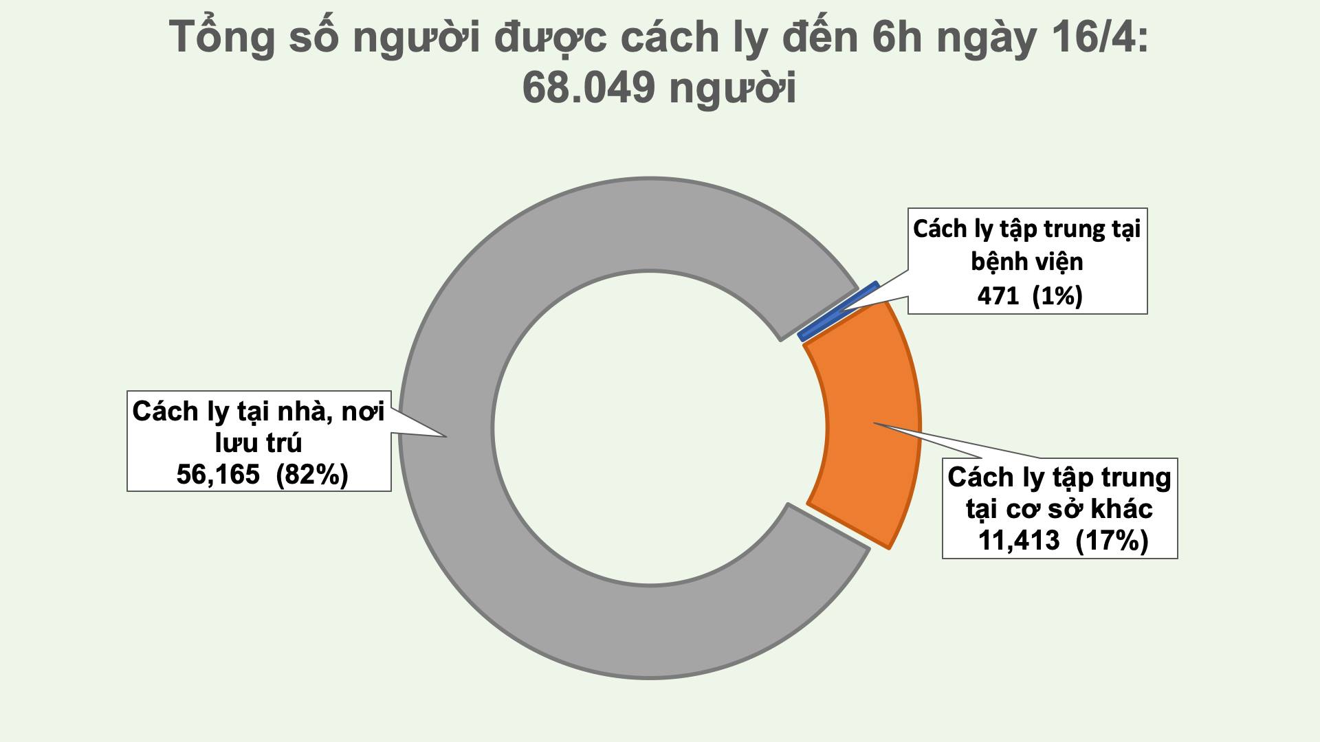 Tổng số người tiếp xúc gần và nhập cảnh từ vùngi dịch đang được theo dõi sức khỏe (cách ly): 68.049, trong đó: Cách ly tập trung tại bệnh viện: 471; Cách ly tập trung tại cơ sở khác: 11.413; Cách ly tại nhà, nơi lưu trú: 56.165.