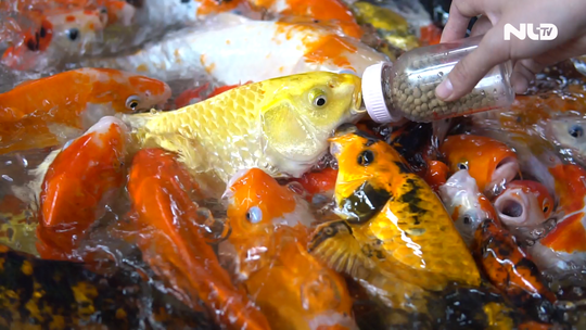 Tại đây, hồ nước được chủ quán thả 300 kg cá koi với gần 500 con đủ màu sắc. Điểm thú vị nhất là chỉ cần cầm một bình sữa bên trong chứa hạt thức ăn, lắc vài tiếng, hàng trăm con cá koi lập tức lao đến bú bình như trẻ em, khiến nhiều người rất thích thú.