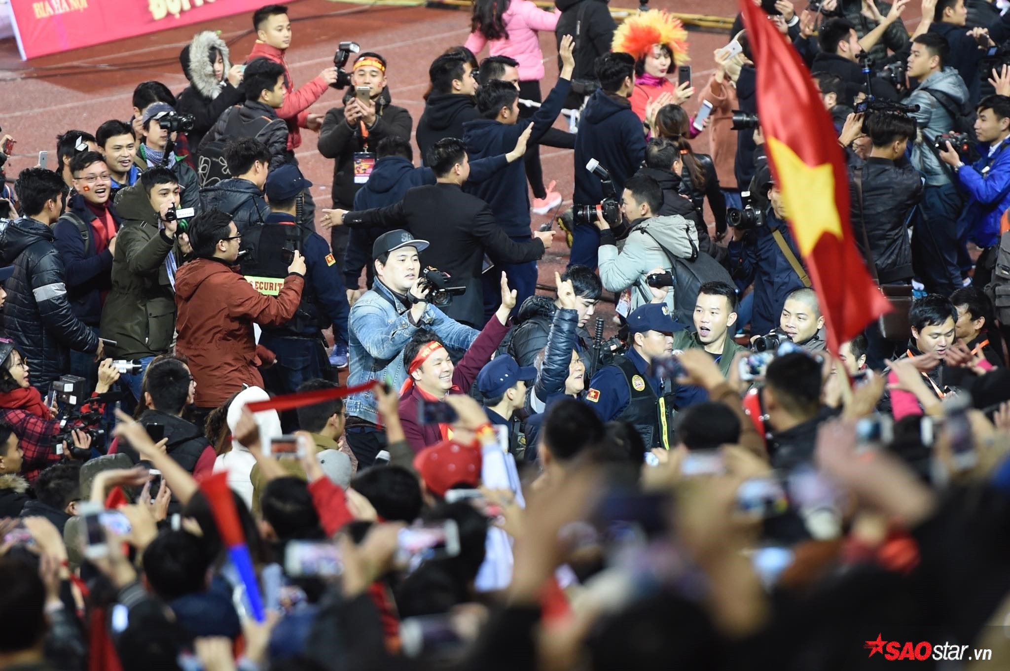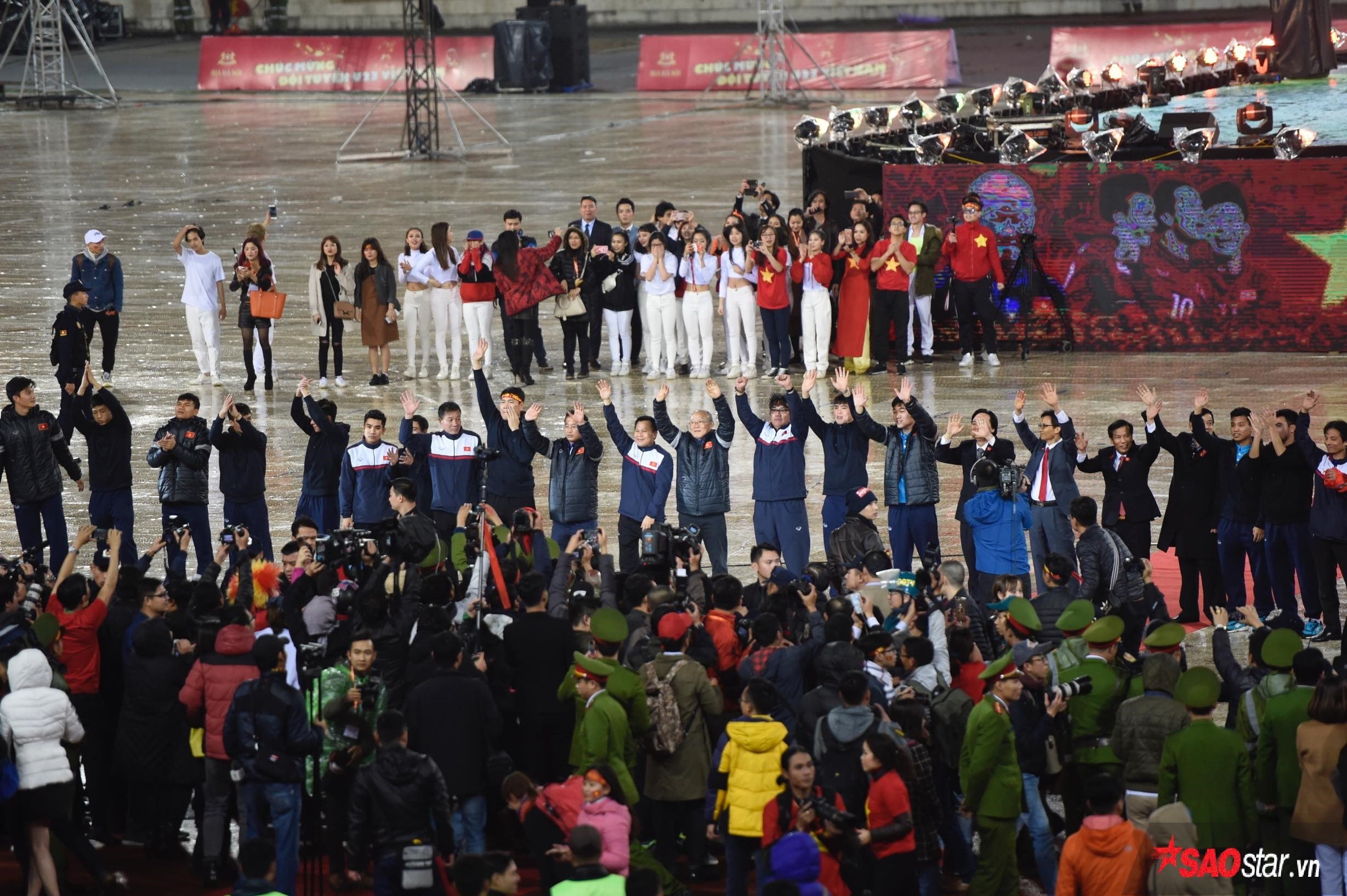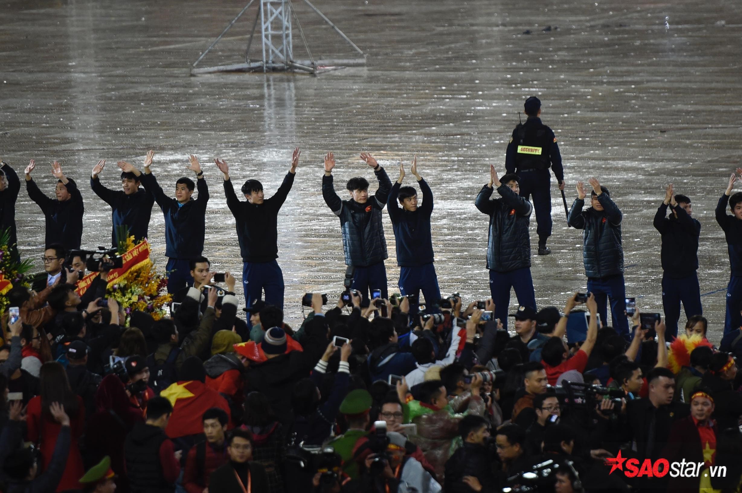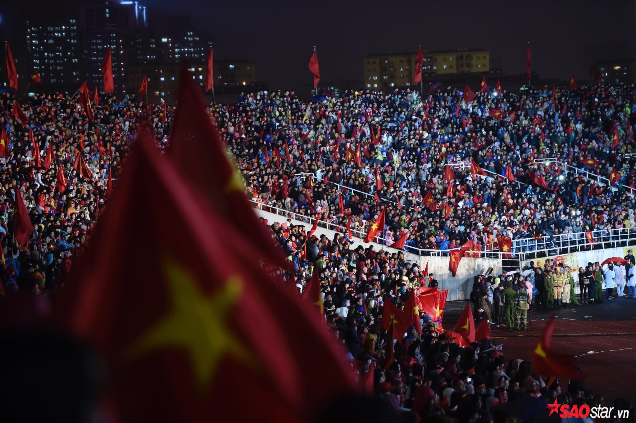 Đến thời điểm này, mặc dù trời đã tối, thời tiết xuống rất thấp nhưng người dân Thủ đô vẫn tưng bừng cổ vũ, chào đón U23 Việt Nam trở về. Tại sân vận động Mỹ Đình, rừng người, rừng cờ đỏ sao vàng phấp phới ngay trên khán đài, không khí vô cùng sôi động và náo nhiệt.