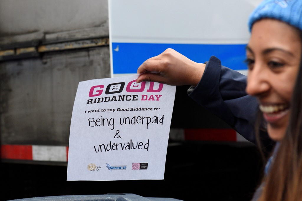 Theo thông lệ, người dân New York ngày 28/12 đến Quảng trường Thời Đại để tham gia “Ngày vứt bỏ những điều phiền muộn”. Ai có điều gì không hài lòng trong năm 2016 có thể viết chúng ra giấy rồi bỏ vào thùng. Những thùng giấy này sau đó sẽ được chuyển lên xe rác chuyên dụng đem đi tiêu hủy. Người phụ nữ trong ảnh đang bỏ vào thùng tờ giấy có chữ “bị trả công thấp” và “bị đánh giá thấp”. Ảnh: Reuters.