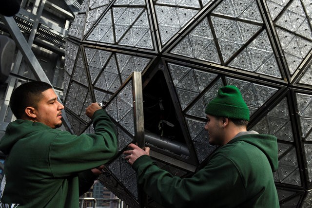 Tại Quảng trường Thời đại ở New York, Mỹ, việc chuẩn bị quả cầu pha lê đón năm mới đang được gấp rút tiến hành với chủ đề “Món quà của lòng nhân ái”. Chủ đề này tượng trưng cho sự đoàn kết trong năm 2017. Quả cầu đặc biệt được bao phủ bởi 2.688 miếng pha lê hình tam giác, được thiết kế để chịu được gió lớn, mưa và thời tiết lạnh. Ảnh: Reuters.