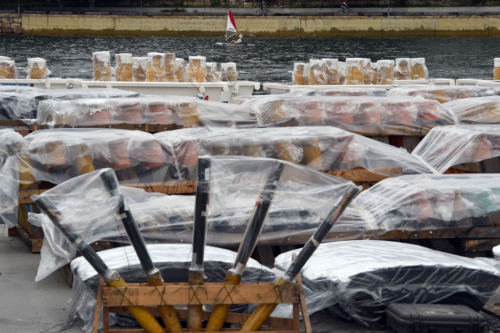 Tại Sydney, Australia, một trong những thành phố lớn đầu tiên đón năm mới, những công việc chuẩn bị cuối cùng cho màn pháo hoa đã sẵn sàng. Đạo diễn năm nay vẫn là ông Fortunato Foti, giám đốc công ty pháo hoa Foti. Gia đình ông Foti đã có 7 đời chuyên chế tác pháo hoa và lên ý tưởng cho các màn trình diễn trên Cầu Cảng Sydney, thu hút hàng triệu người xem trực tiếp và qua màn hình. Trong ảnh là thuyền buồm đặt pháo hoa tại Cầu Cảng Sydney. Ảnh: Getty.