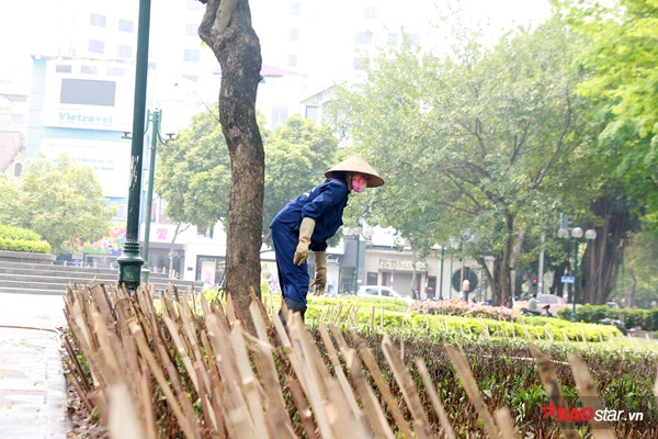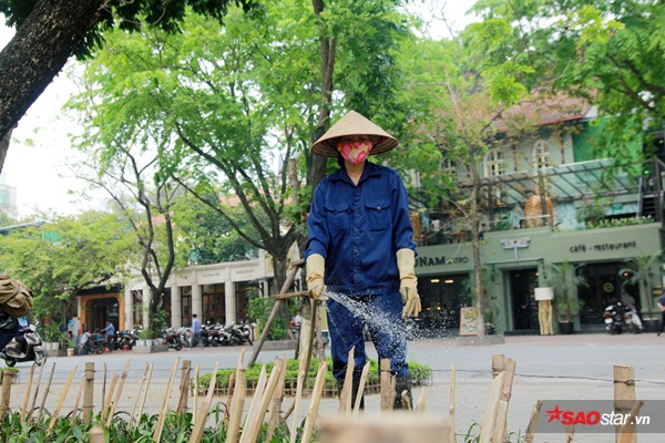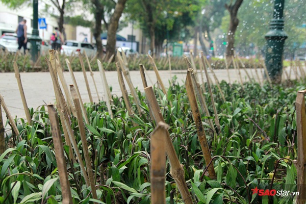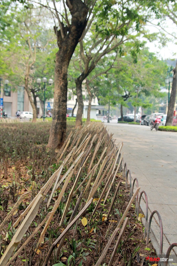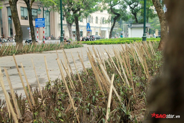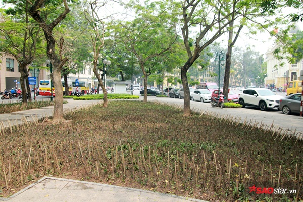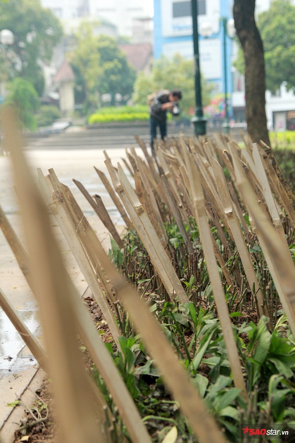 Cụ thể, Công ty Công viên cây xanh Hà Nội yêu cầu công nhân cắm hàng loạt thanh tre xung quanh các bồn hoa, cây xanh để bảo vệ cây. Theo tìm hiểu của phóng viên Saostar, vườn hoa này vừa được thay cây và hoa nên họ đã căm chông để ngăn… đàn chó giẫm đạp lên cây mới trồng.