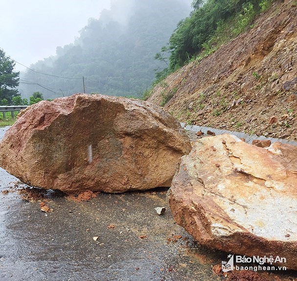 Đá rơi từ trên núi cao xuống Quốc lộ 16 đoạn qua huyện Kỳ Sơn. Ảnh Báo Nghệ An.