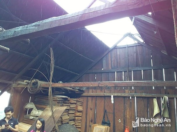 Nhà ông Và Nênh Lầu ở bản Huồi Mới 1, xã Tri Lễ, Quế Phong bị lốc xoáy làm bay phần nóc. Ảnh Báo Nghệ An.