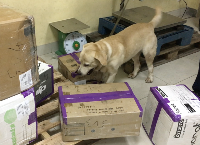 Chó nghiệp vụ tìm ma tuý trong các thùng hàng