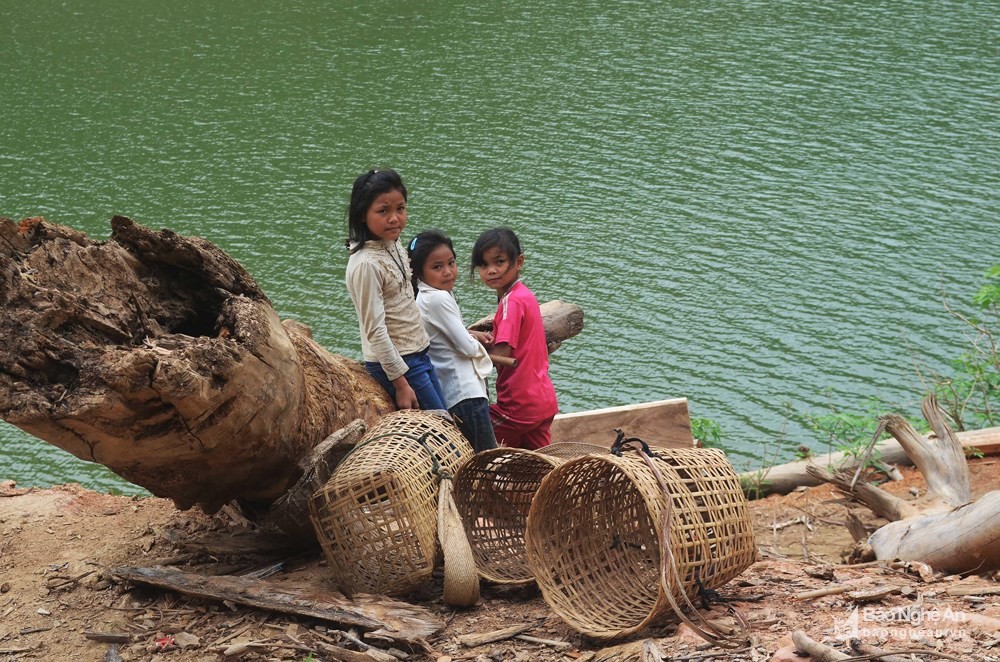 Những đứa bé ở vùng lòng hồ đang chờ thuyền để sang bên kia sông hái lượm rau quả.
