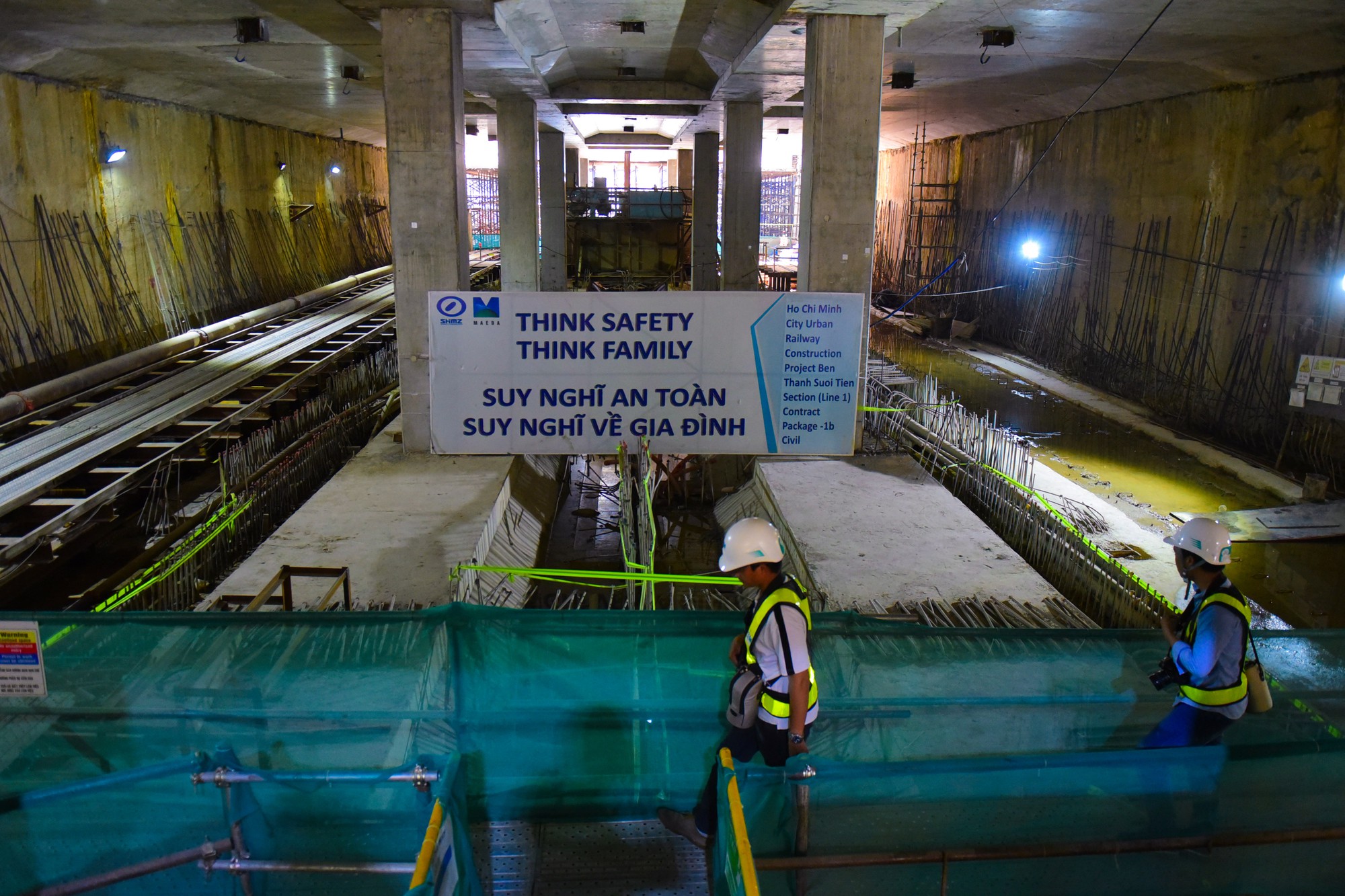 Công nhân đang thi công phần nền tầng hầm của nhà ga Ba Son, nơi đang đào tuyến đường hầm Ba Son - Nhà hát Thành phố.