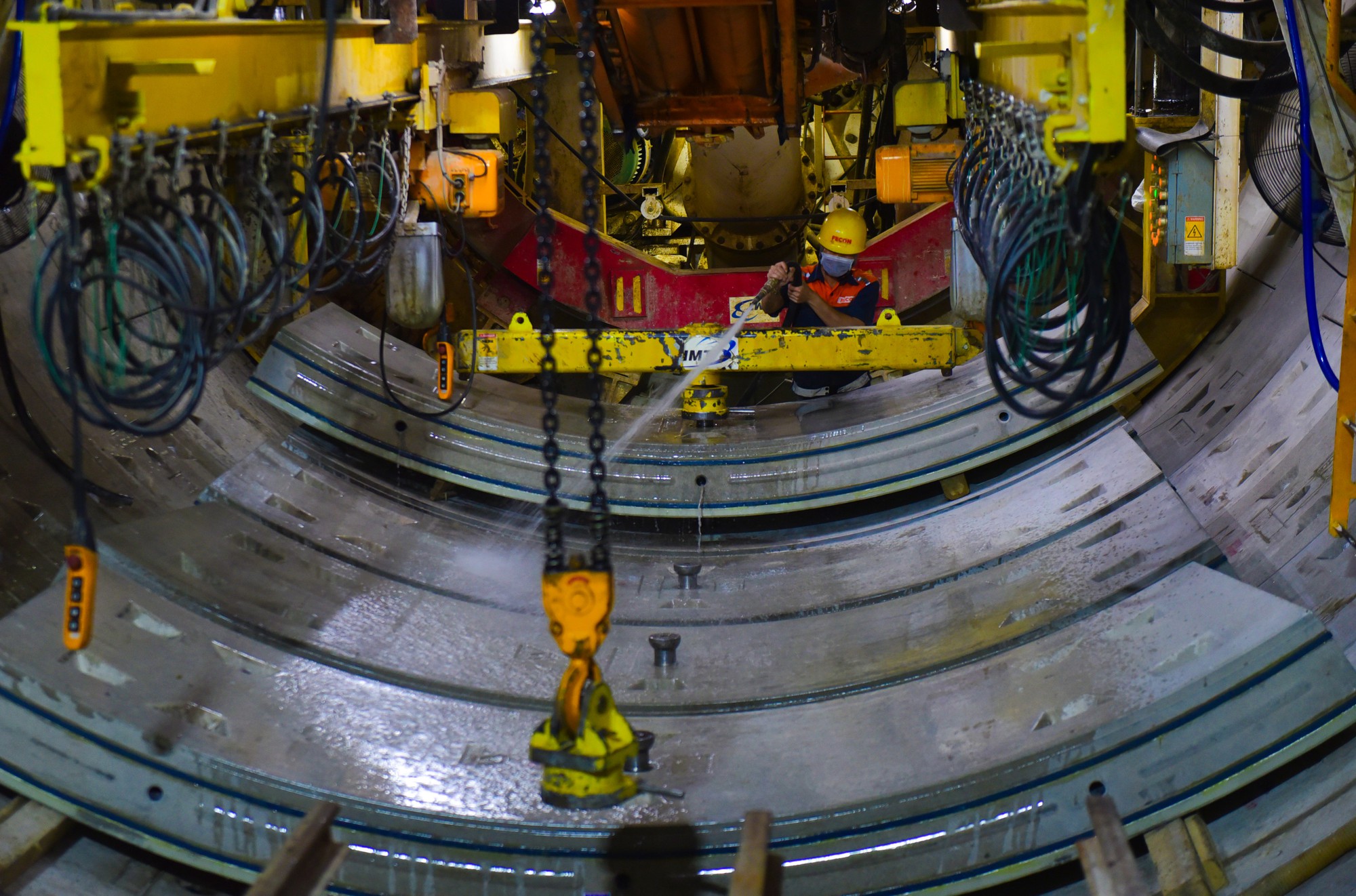 Trước khi được lắp đặt vào vị trí, những khối kiện vỏ hầm bằng bê tông nặng tới 2,5 tấn sẽ được công nhân làm sạch bằng nước.