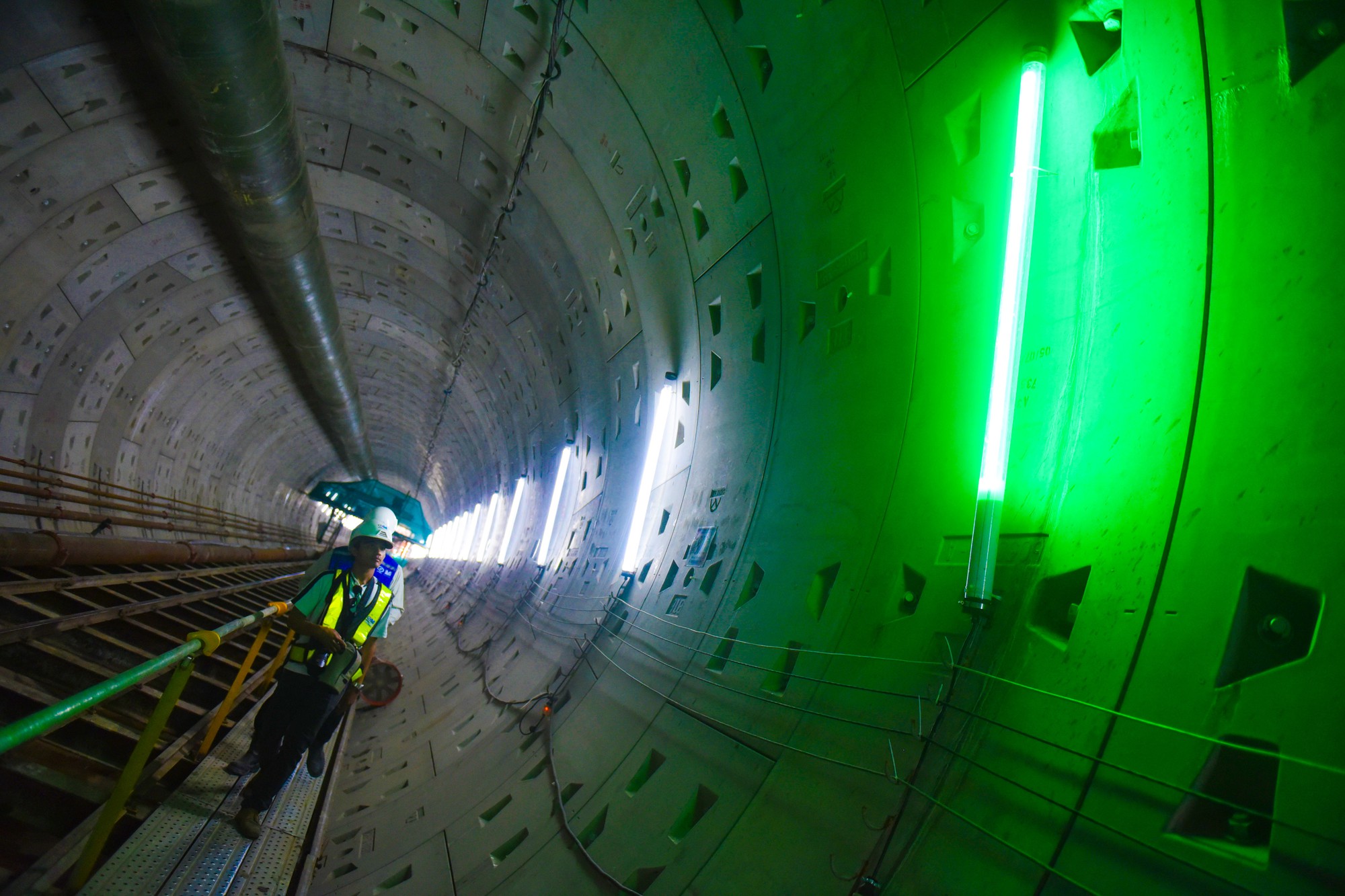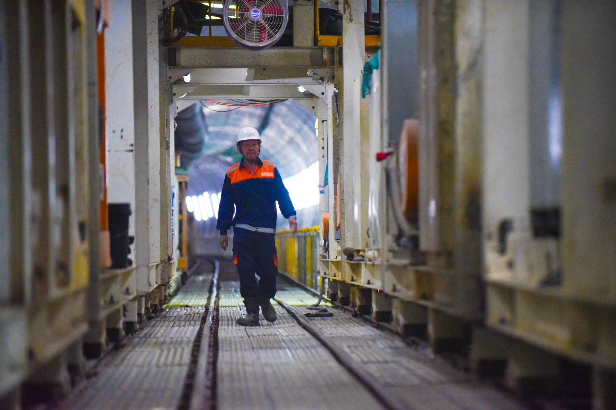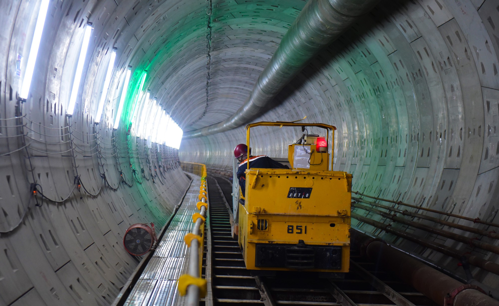 Những khối bê tông nặng 2,5 tấn, dài 3,5m, dày 30cm được công nhân đưa vào bằng đường giây chạy dài suốt tuyến hầm.