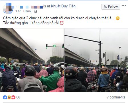 Trên trang cá nhân của mình, chị Lưu Ly cũng chia sẻ hình ảnh cả đoàn phương tiện đứng chôn chân tại khu vực đường Khuất Duy Tiến cùng dòng chia sẻ, “Cảm giác qua 2 chục cái đèn xanh rồi còn không được di chuyển thật là… Tắc đường gần 1 tiếng đồng hồ rồi”.