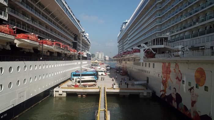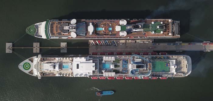 Tàu World Dream (bên phải) thuộc hãng tàu Dream Cruise (Hong Kong) dài 335,2m, quy mô 18 tầng, có trọng tải 15.370 DWT và sức chứa tối đa lên tới 5.400 du khách và thuyền viên.