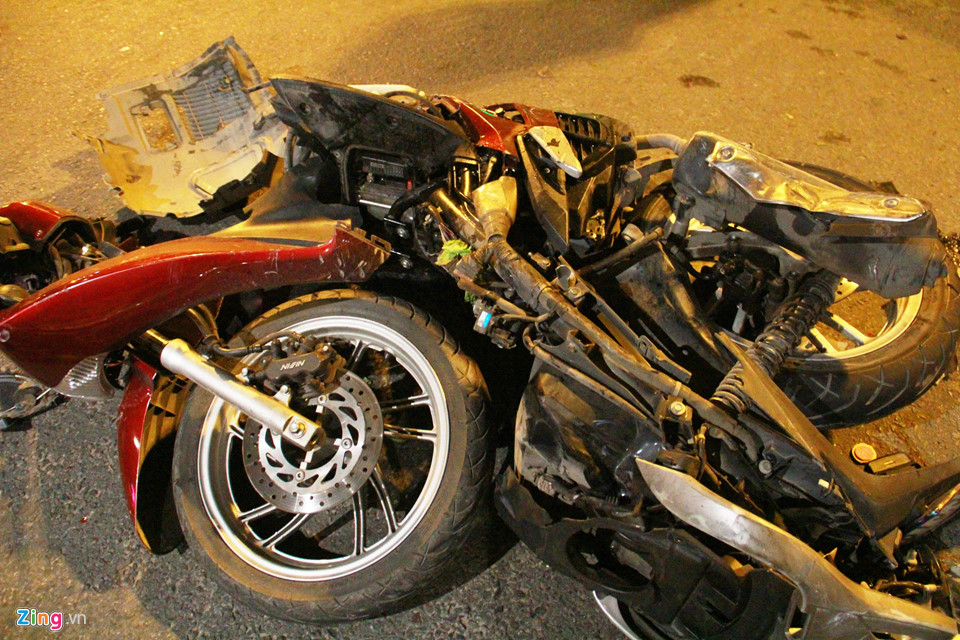 4 trong 5 chiếc xe máy nằm la liệt trên đường và bị vỡ nát.