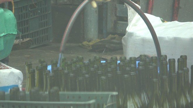 Ở bên ngoài xưởng, hàng ngàn chai sành cũ dạng sâm panh và vang nho được nhập về từ nhiều nơi, sục rửa một lần duy nhất trước khi được sử dụng để đóng rượu thành phẩm. Một mẻ rượu mới chuẩn bị “cháy” hàng.