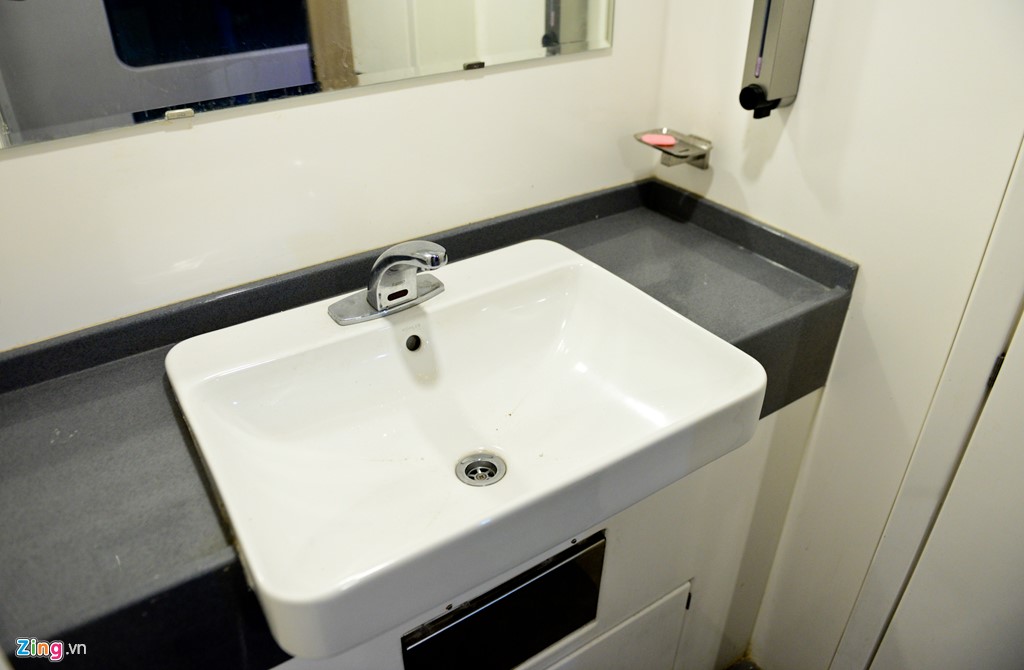 Hệ thống vệ sinh tự hoại công nghệ tiên tiến, bồn rửa mặt với vòi nước thiết bị cảm ứng, cửa phòng vệ sinh được thiết kế cửa gấp 2 cánh.