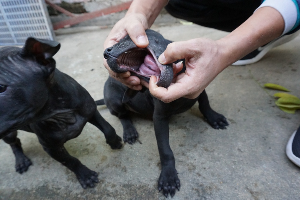 Lưỡi chó có đốm màu đen. Răng đầy đủ, chắc khoẻ, các răng cửa cắn khít vào nhau hình cắt kéo.