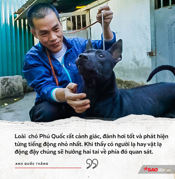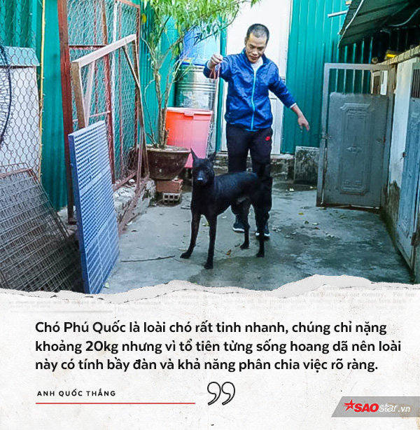 Gắn bó với dòng chó cổ thuần chủng của Việt Nam sống ở huyện đảo Phú Quốc, tỉnh Kiên Giang cách đây gần 30 năm, anh Thắng đặc biệt yêu thích những con đầu đàn oai phong, tinh khôn và có khả năng săn bắt mồi cực tốt. Nếu để ý quan sát sẽ dễ nhận thấy sự phân công công việc rõ ràng trong đàn chó khi chúng săn mồi: Con chặn đầu, con chặn hậu, con truy đuổi và con kết thúc.