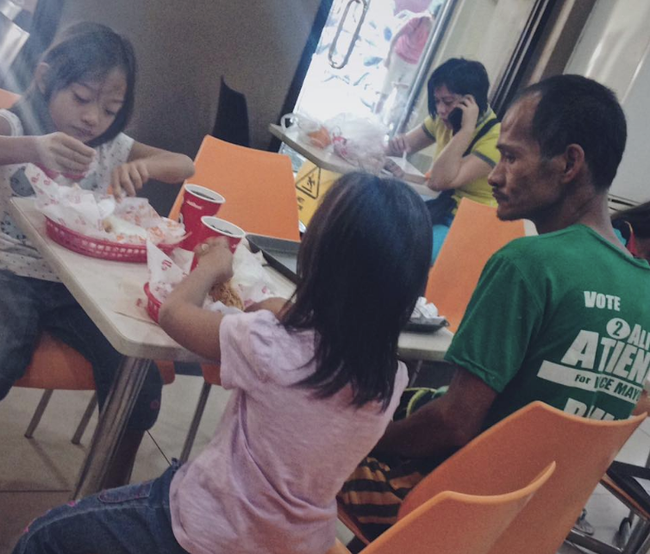 Vì điều kiện kinh tế không cho phép vậy nên anh Ryan Arebuabo (38 tuổi) đến từ Manila, Philippines đã phải dành dụm và quyết tâm lắm mới có thể đưa 2 cô con gái nhỏ, 6 và 8 tuổi, đi ăn một bữa gà rán trong cửa hàng đồ ăn nhanh.