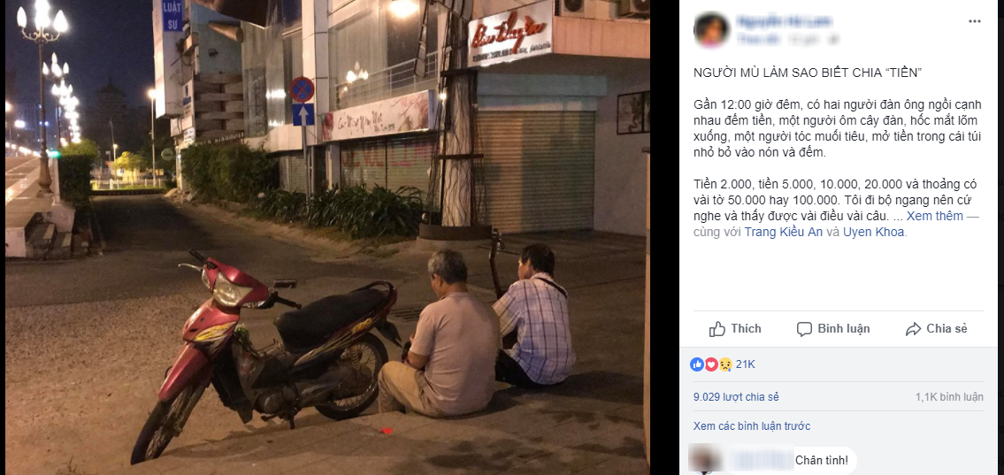 Tài khoản N.H.L bùi ngùi chia sẻ câu chuyện “Người mù làm sao biết chia “tiền”: “Gần 12h đêm, có hai người đàn ông ngồi cạnh nhau đếm tiền, một người ôm cây đàn, hốc mắt lõm xuống và một người tóc muối tiêu, mở tiền trong cái túi nhỏ bỏ vào chiếc nón và đếm.