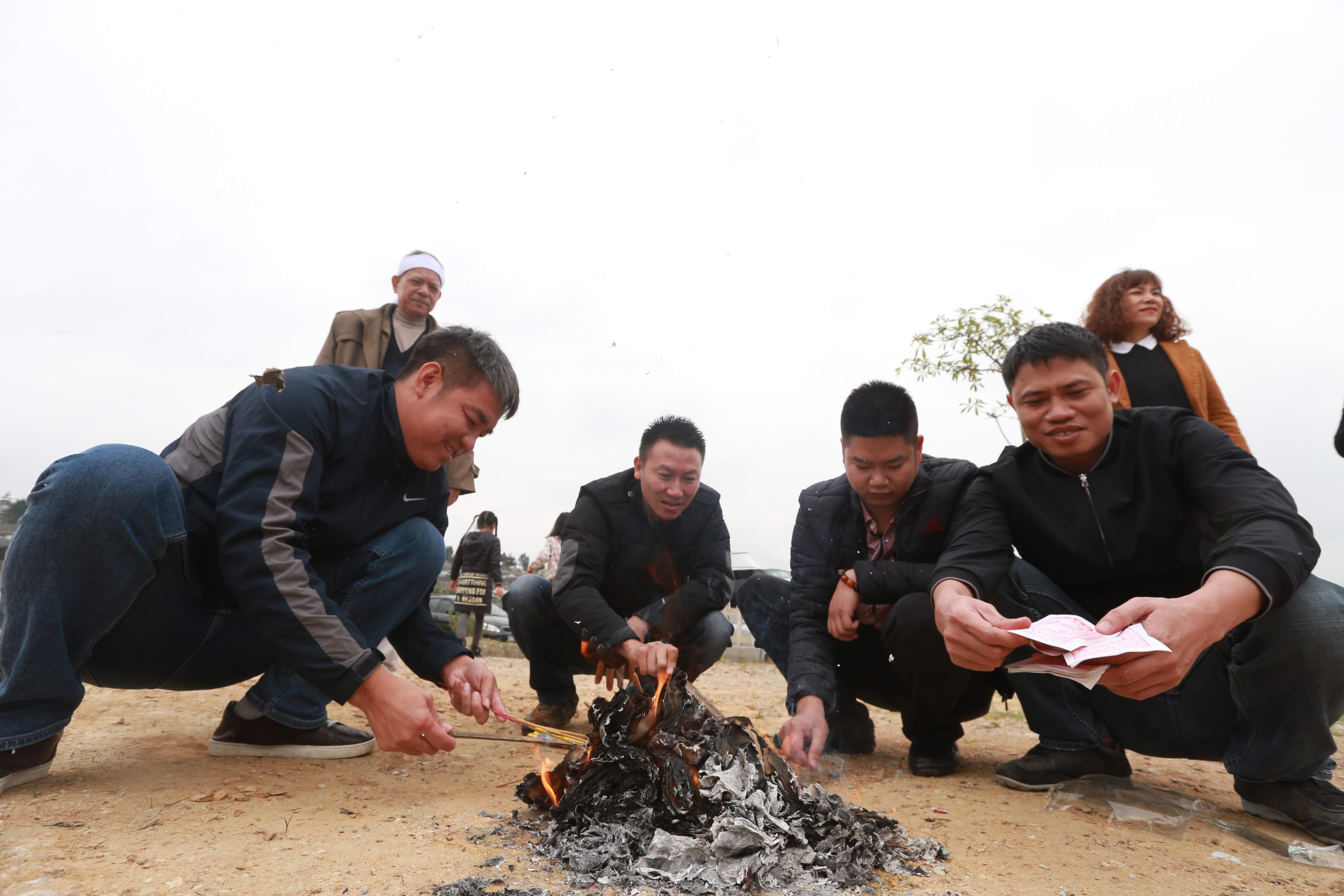 Mọi người quây quần đốt vàng mã cho tổ tiên.