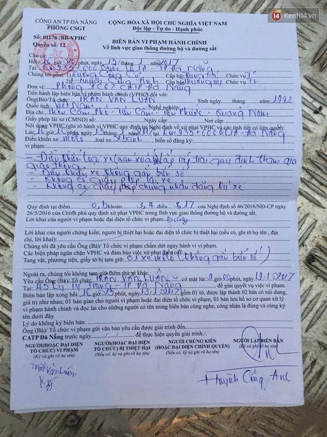 Trước đó, khoảng 16h10 chiều 13/1, cán bộ chiến sĩ Trạm CSGT trạm cửa ô Hòa Phước đang làm nhiệm vụ tuần tra trên quốc lộ 1A (đoạn qua huyện Hòa Vang) thì phát hiện anh Trần Văn Luân (25 tuổi, trú xã Tiên Cẩm, huyện Tiên Phước, Quảng Nam)đang điều khiển một chiếc môtô tự lắp ráp không có biển số nên đã yêu cầu dừng xe để kiểm tra.