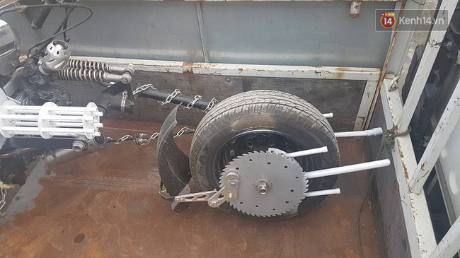 Đặc biệt, phần khung xe được cuốn dây xích sắt, trên xe có “súng đại liên” với phần đạn giả được chế lại nhìn qua như đạn thật, 6 nòng nòng súng là những ống thép nhỏ có khả năng quay khi tăng ga.