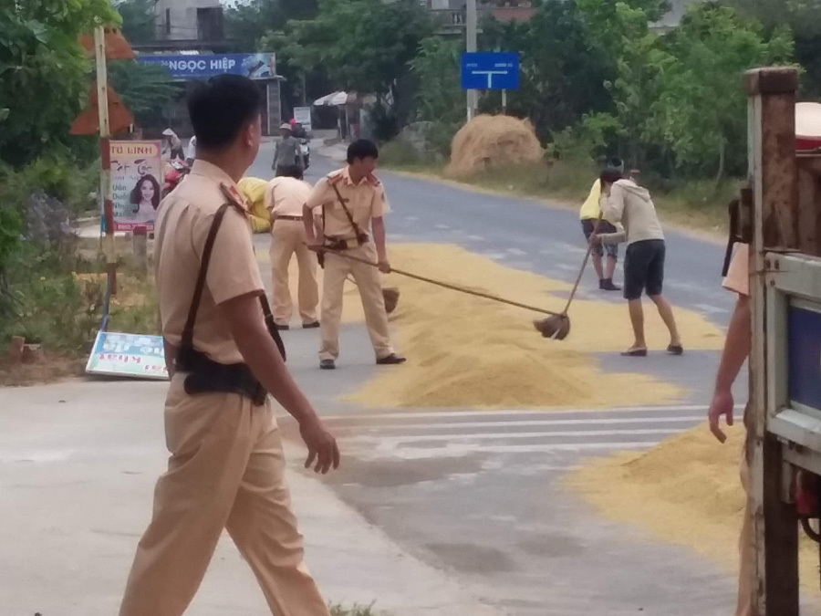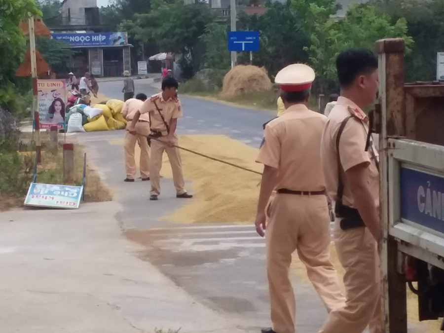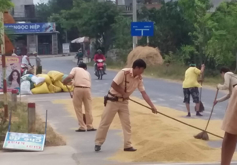 Các chiến sĩ cảnh sát giao thông huyện Vĩnh Linh, tỉnh Quảng Trị giúp bà con gom thóc sáng ngày 22/4. Ảnh: Kiểm Nguyễn