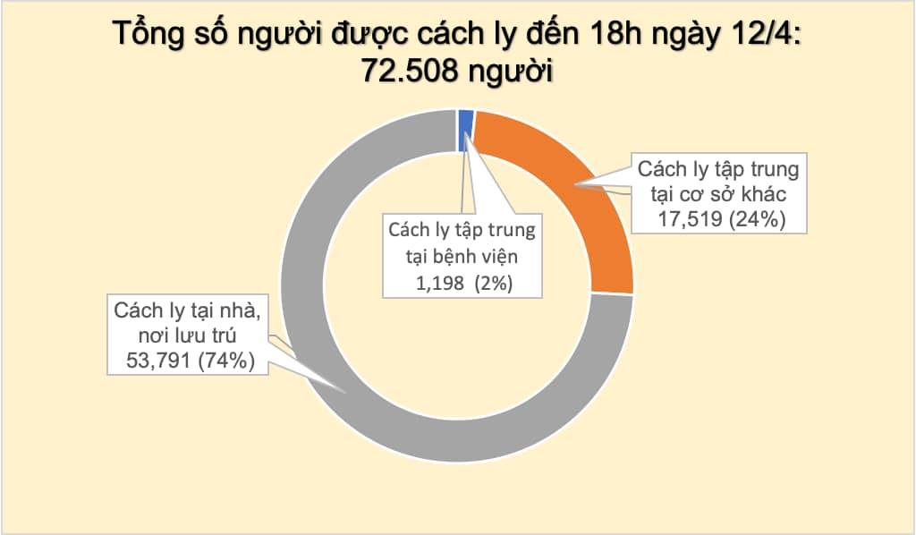 Tính đến 18h ngày 12/4, tổng số ca mắc COVID-19 tại Việt Nam là 260. Trong đó có 159 người (61,2%) mắc bệnh từ ổ dịch nước ngoài về Việt Nam; 101 người (38,8%) trong nước lây thứ phát. Có 118/159 người từ nước ngoài về được đưa vào cách ly ngay, sau đó xét nghiệm dương tính với SARS-CoV-2.