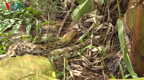 Cặp trăn gấm đã được thả về khu bảo tồn thiên nhiên. Ảnh: VOV.