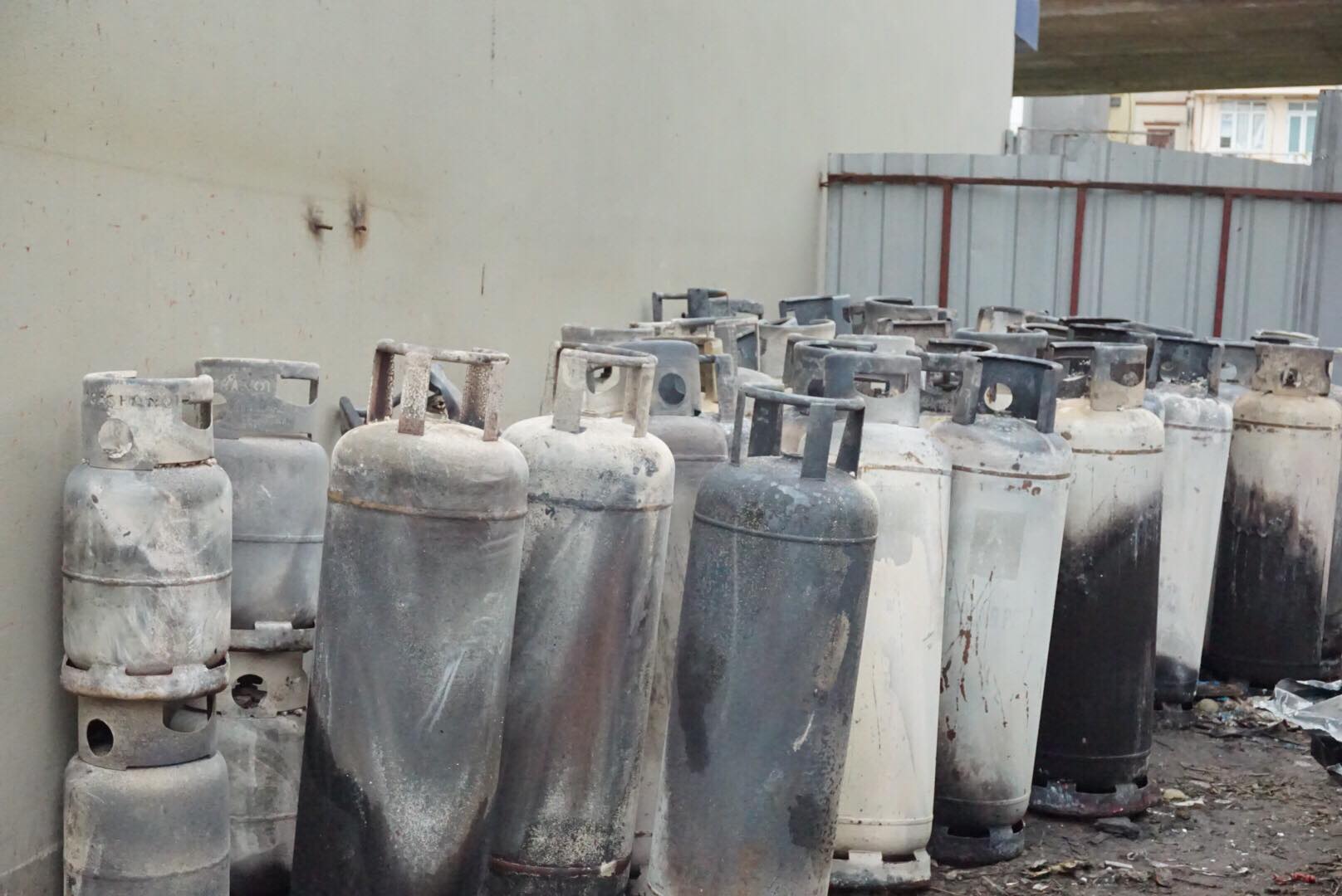 Nhiều bình gas được đưa ra ngoài hiện trường tránh phát nổ.