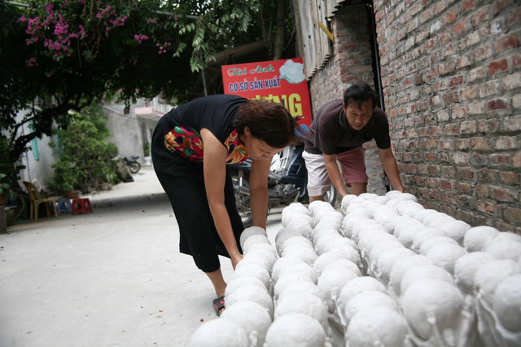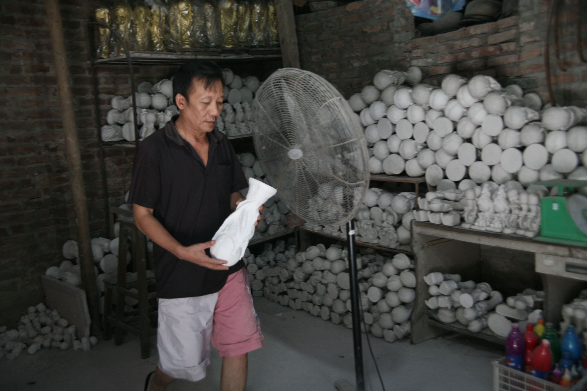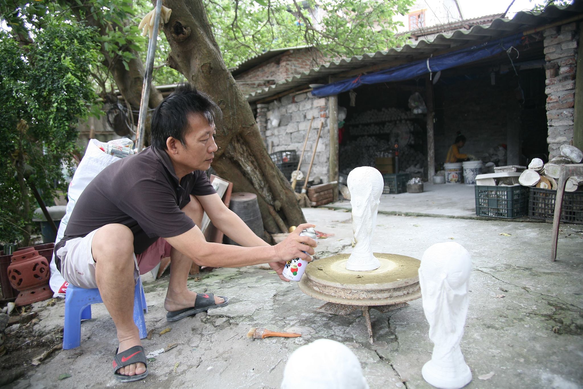 Sau khi đổ khuôn chừng 20 phút thì tháo khuôn, đem ra phơi chừng 3 nắng, nếu không phơi khô thì sản phẩm rất dễ hỏng. Công đoạn tiếp theo là gọt dũa lại sản phẩm, kế đó là phun sơn.